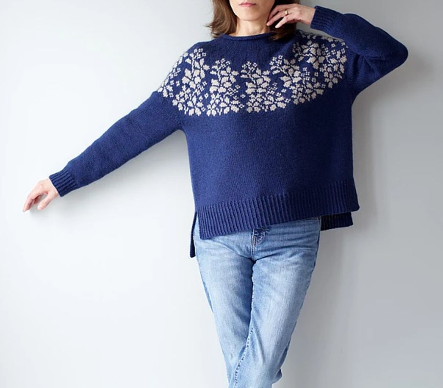 Lauren - это жаккардовый пуловер с цветочной кокеткой, которая одинаково красиво смотрится на темном или светлом фоне.